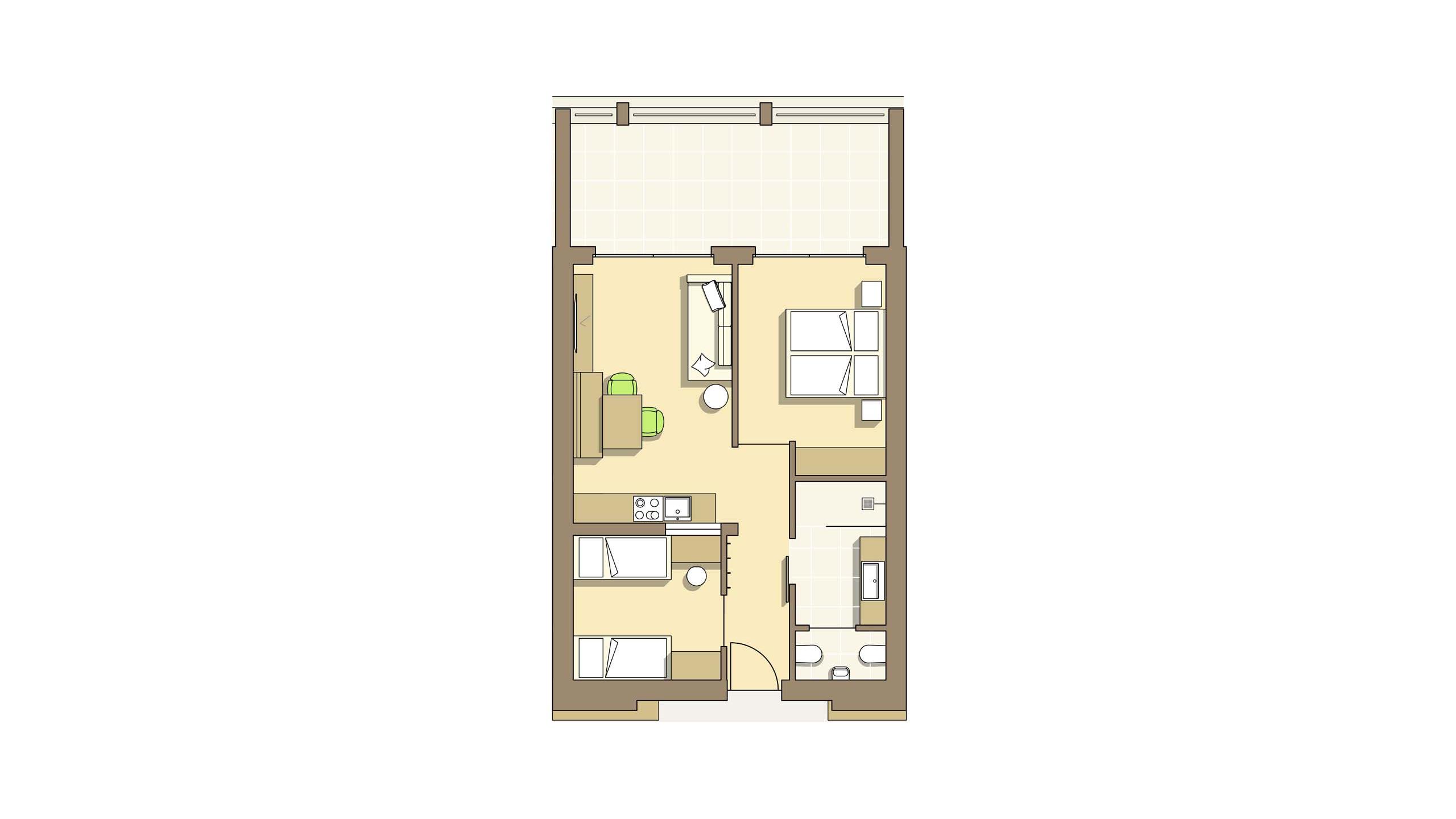 Apartment Mangolia delights with its stylish design and plenty of feel-good flair. You can look forward to a spacious apartment with a double bedroom, a twin bedroom, and a large living and dining area with sofa bed. Soft, muted colours create a serene ambience, while refined design elements lend the apartment its unique charm. Amenities include a kitchenette, a bathroom with shower, a separate WC, and a 19 m² balcony. Location: on the first floor with a view of the characteristic restaurant roof.