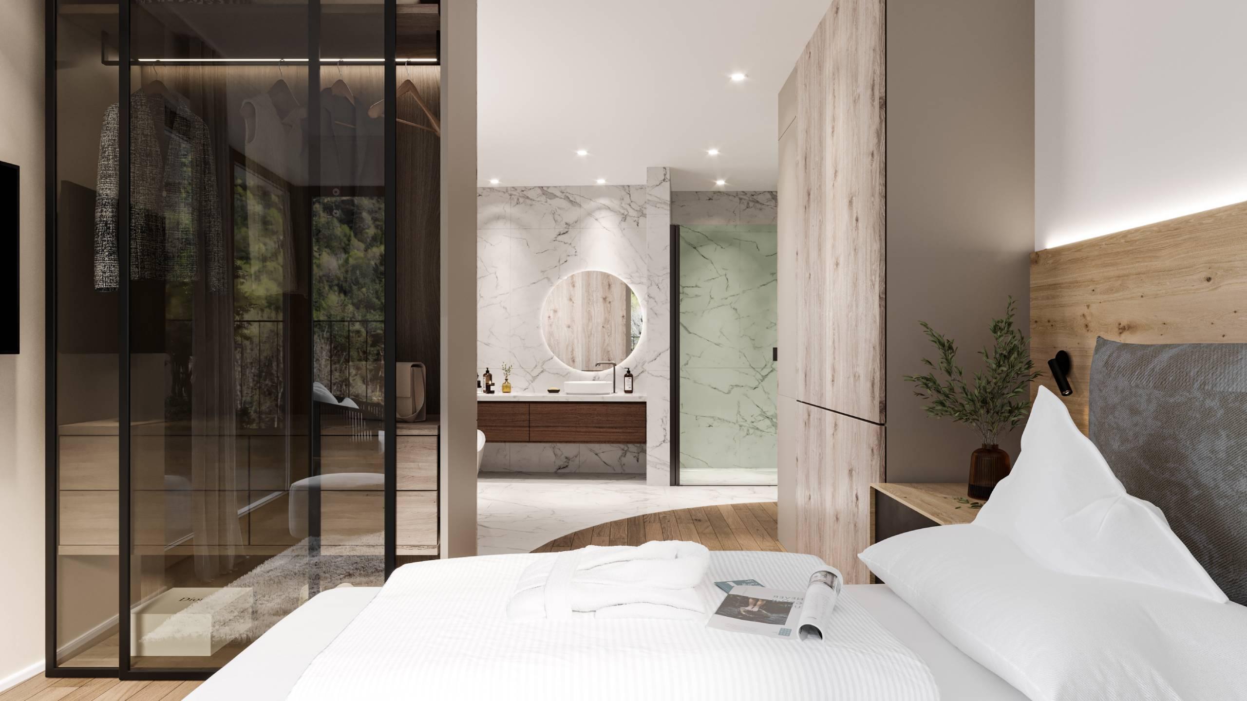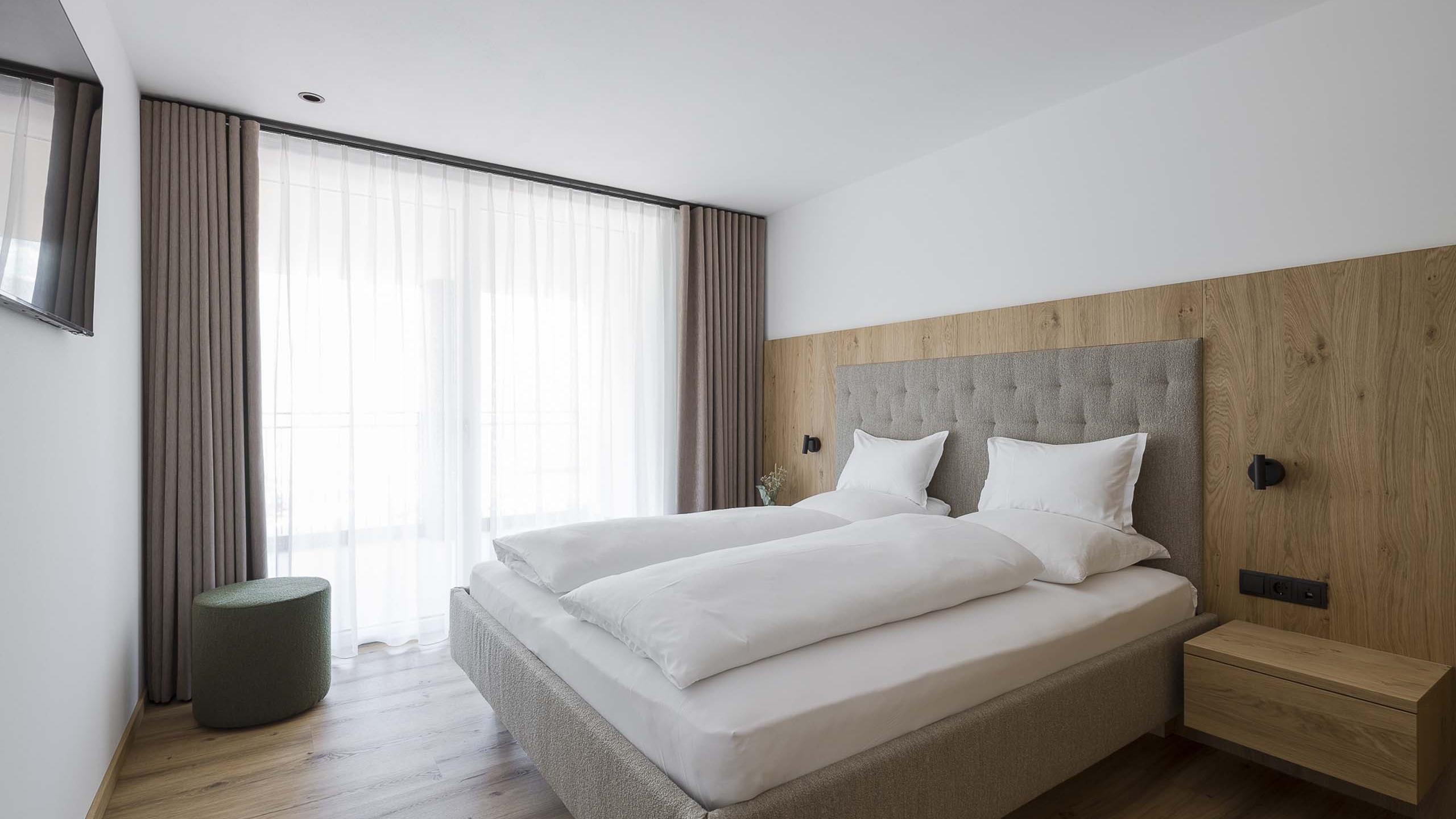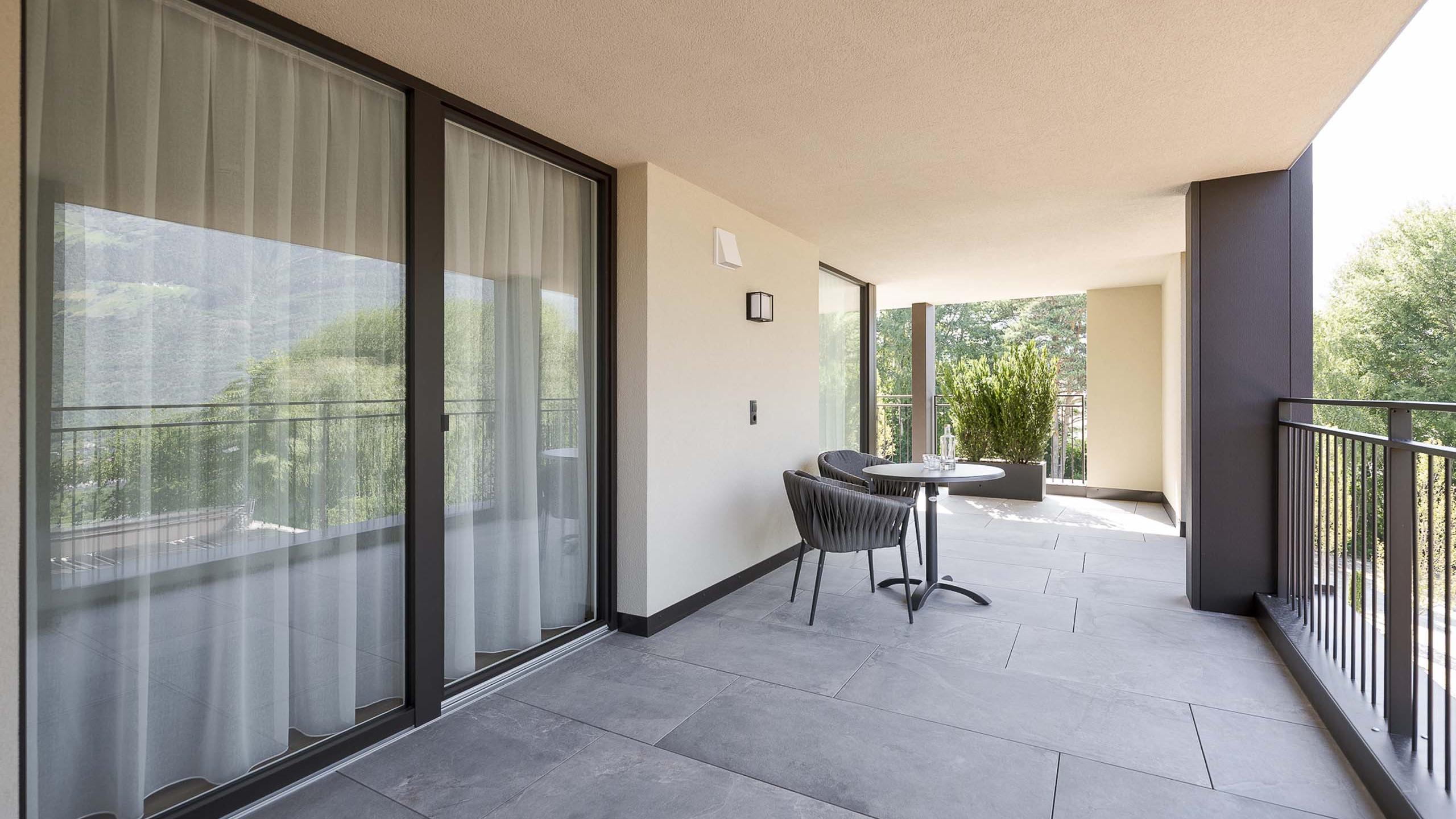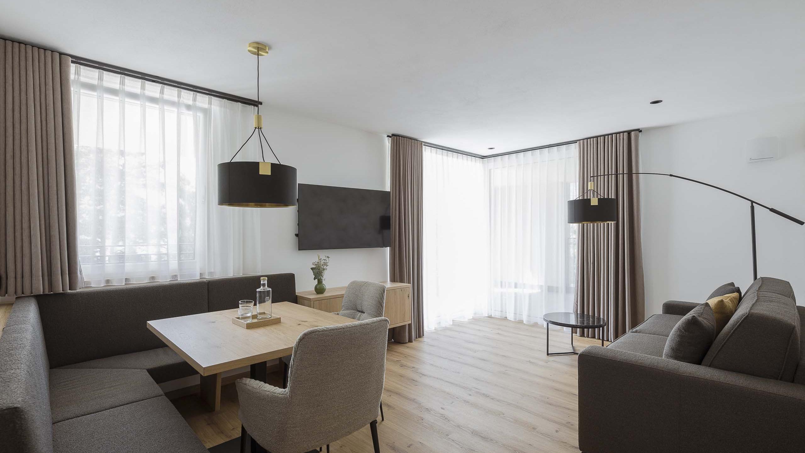 Gemütliches Apartment mit geräumigem Doppelzimmer sowie Schlafcouch. Sanfte, gedeckte Farben sorgen für eine erholsame Stimmung, stilvolle Designelemente verleihen dem Apartment das besondere Etwas. Je nach Lage überrascht der Ausblick mit unterschiedlichen Eindrücken, dabei immer mit jeder Menge Tageslicht. Es ist ausgestattet mit einer Küchenzeile, komfortablem Wohn- und Essbereich, einem Badezimmer mit Dusche, separatem WC sowie mit einer 31 m² großen Terrasse.