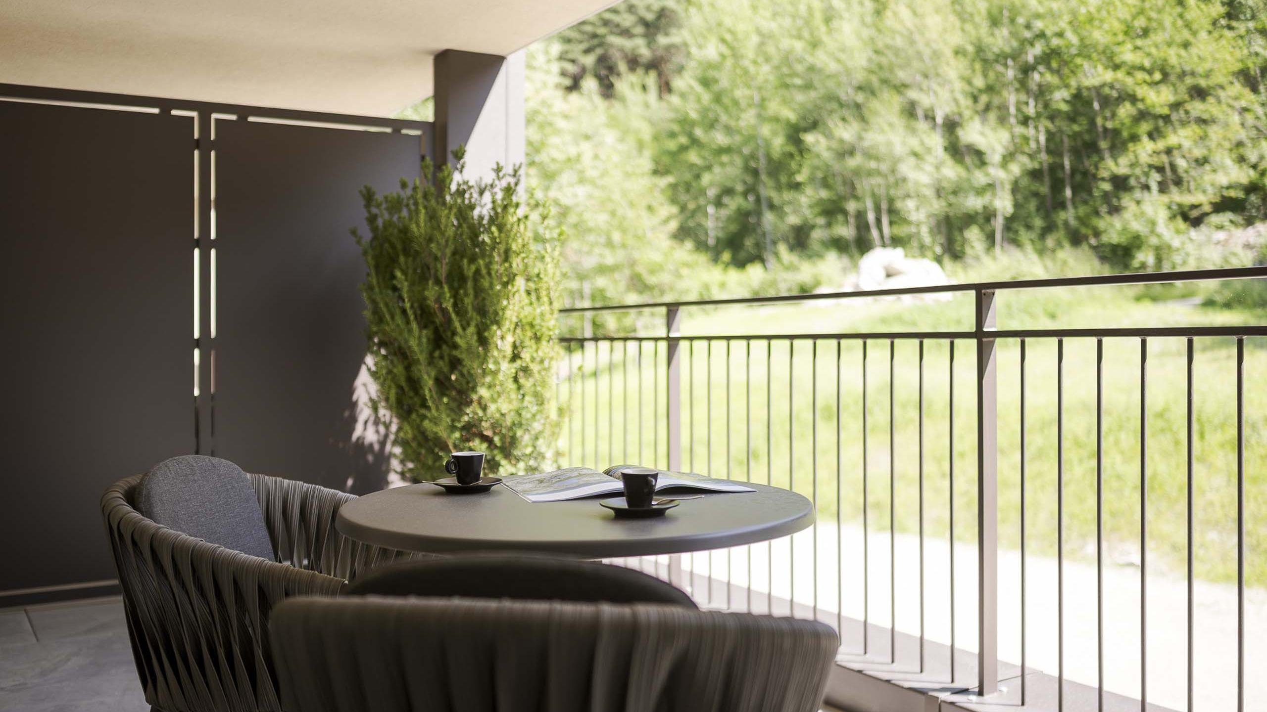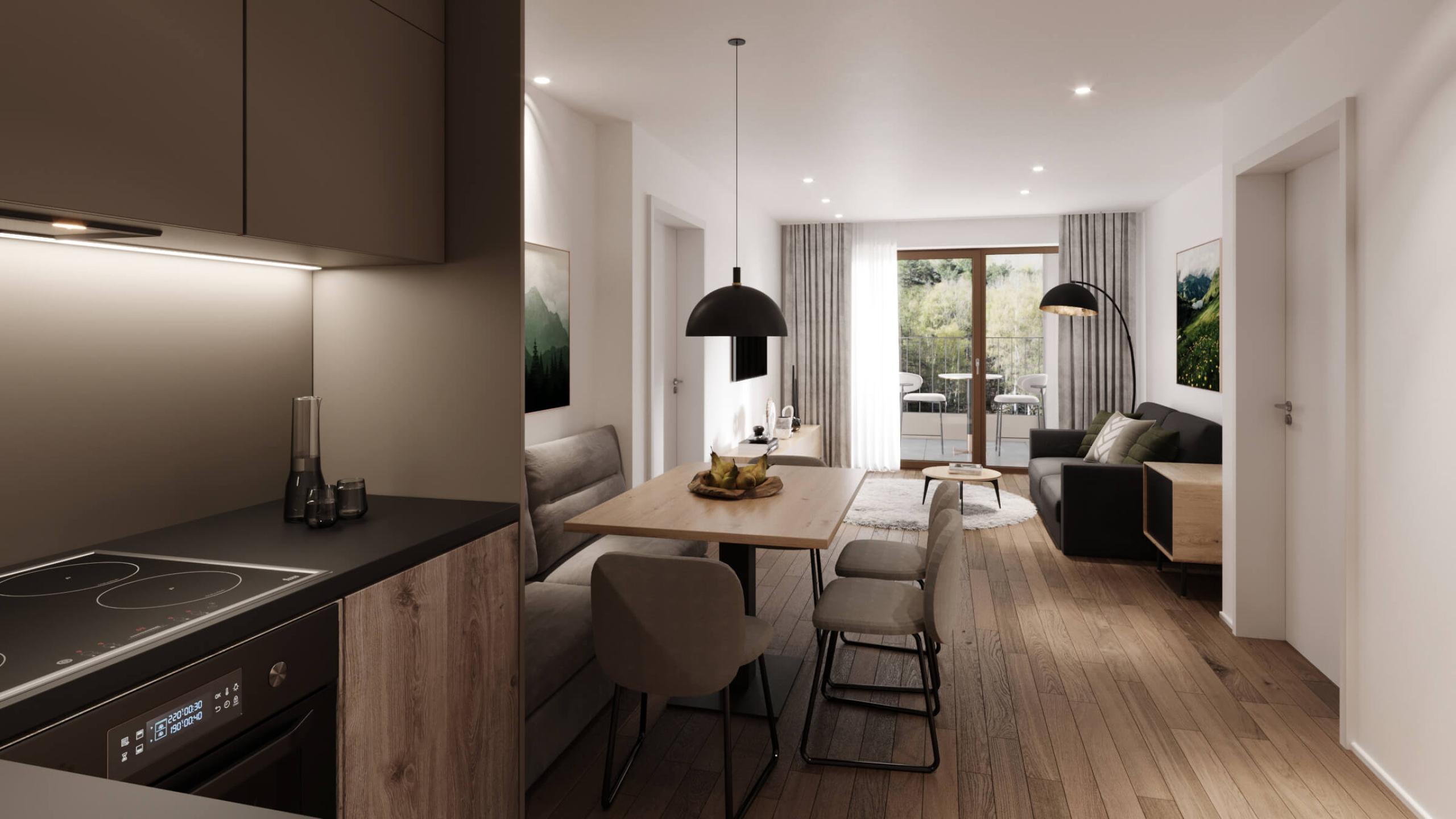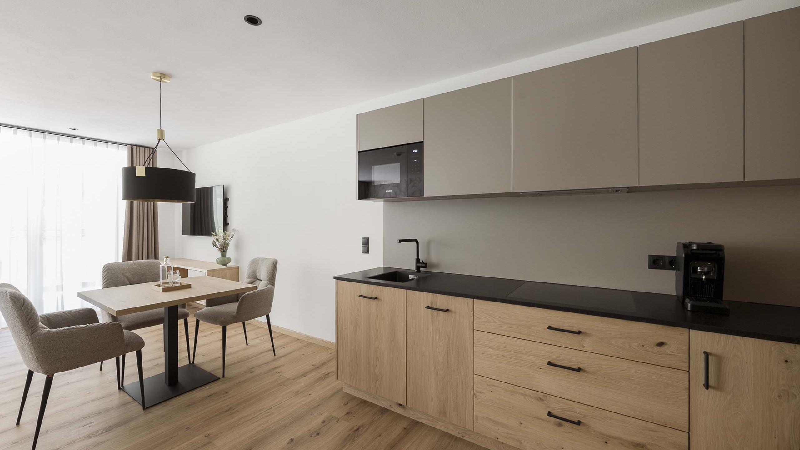 Tranquillo appartamento con letto matrimoniale rotondo e divano letto. Colori tenui e delicati rendono l’atmosfera rilassante, mentre gli elementi di design danno un tocco speciale all’appartamento. È dotato di un angolo cottura, di un’area salotto, di un bagno con doccia, di un WC separato e di un balcone di 14 m² con vista sulle montagne.